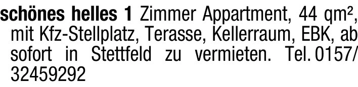 Schönes helles 1 Zimmer Appartment, 44 qm, mit Kfz-Stellplatz, Terrasse, Kellerraum, EBK, ab sofort in Stettfeld zu vermieten.