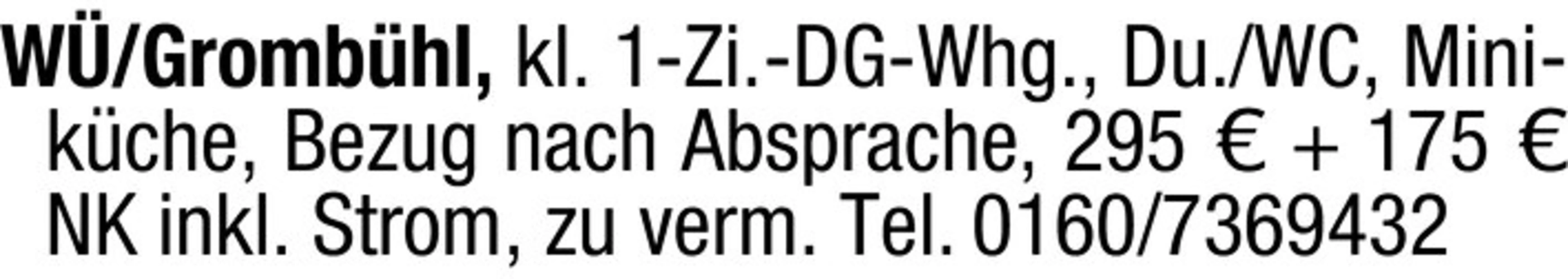 W/Grombhl, kl. 1-Zi.-DG-Whg., Du./WC, Minikche, Bezug nach Absprache, 295 175 NK inkl. Strom, zu verm. Tel. 0160/7369432
