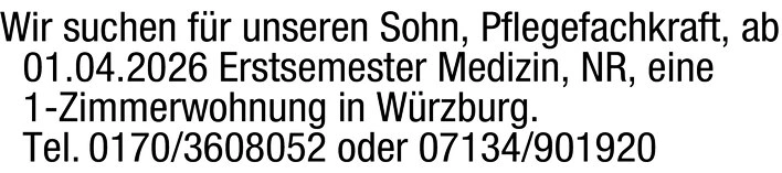 Wir suchen für unseren Sohn, Pflegefachkraft, ab 01.04.2026 Erstsemester Medizin, NR, eine 1-Zimmerwohnung in Würzburg.