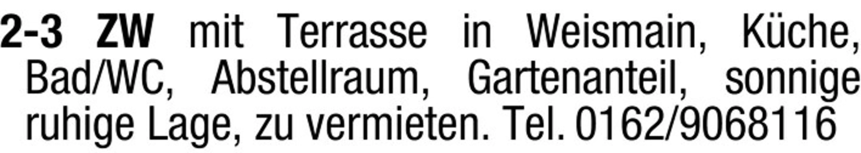 2-3 ZW mit Terrasse in Weismain, Kche, Bad/WC, Abstellraum, Gartenanteil, sonnige ruhige Lage, zu vermieten. Tel. 0162/9068116