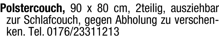 Polstercouch, 90 x 80 cm, 2teilig, ausziehbar zur Schlafcouch, gegen Abholung zu verschenken.