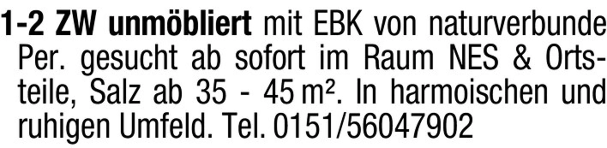 1-2 ZW unmbliert mit EBK von naturverbunde Per. gesucht ab sofort im Raum NES & Ortsteile, Salz ab 35 - 45 m. In harmoischen und ruhigen Umfeld. Tel: 0151/56047902