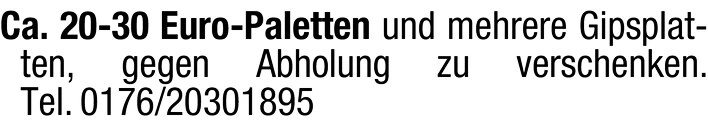 Ca. 20-30 Euro-Paletten und mehrere Gipsplatten, gegen Abholung zu verschenken.