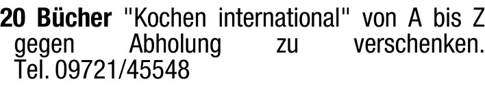 20 Bücher "Kochen international" von A bis Z gegen Abholung zu verschenken.