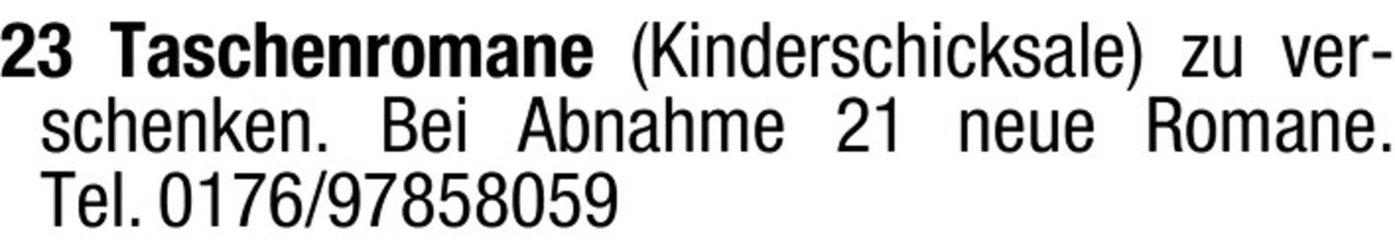 23 Taschenromane (Kinderschicksale) zu verschenken. Bei Abnahme 21 neue Romane. Tel. 0176/97858059
