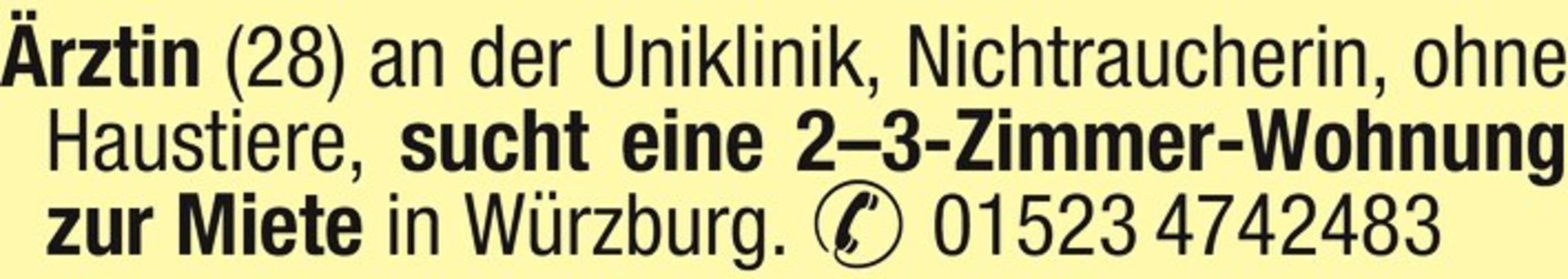 rztin (28) an der Uniklinik, Nichtraucherin, ohne Haustiere, sucht eine 2-3-Zimmer-Wohnung zur Miete in Würzburg. 01523 4742483