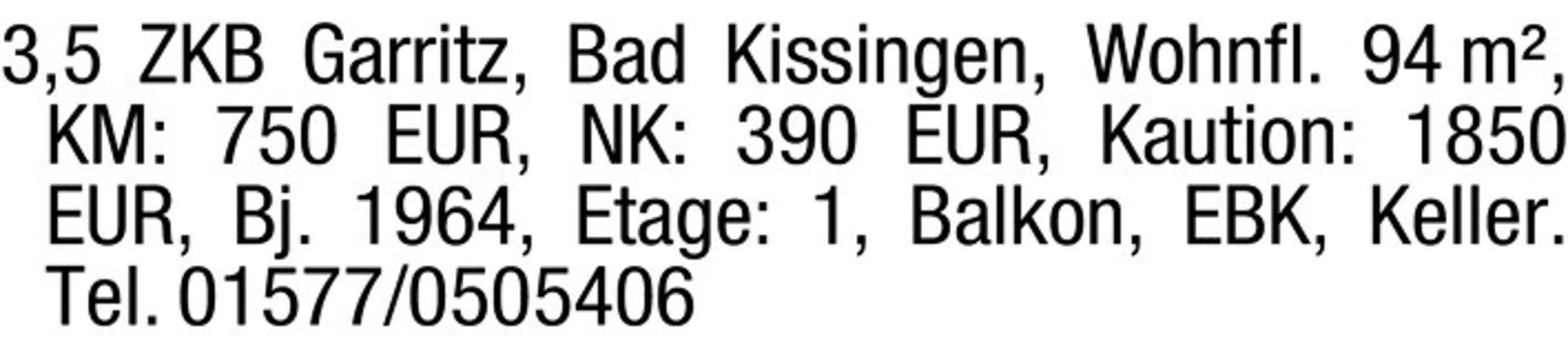 3,5 ZKB Garritz, Bad Kissingen, Wohnfl. 94 m, KM: 750 EUR, NK: 390 EUR, Kaution: 1850 EUR, Bj. 1964, Etage: 1, Balkon, EBK, Keller. Tel. 01577/0505406