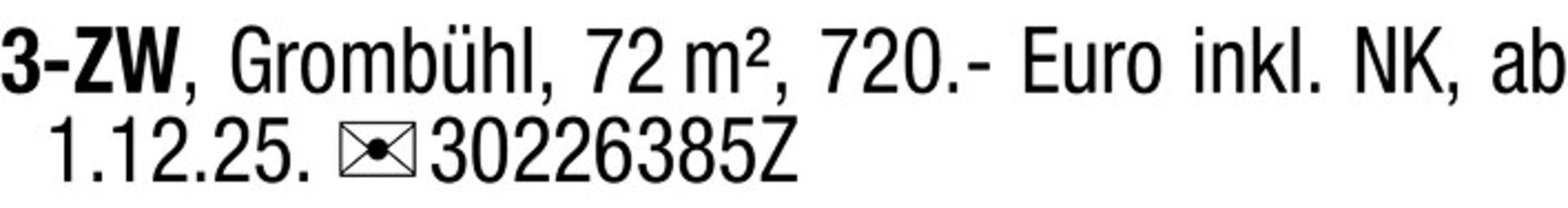 3-ZW, Grombhl, 72 m, 720.- Euro inkl. NK, ab 1.12.25. Chiffre 30226385
