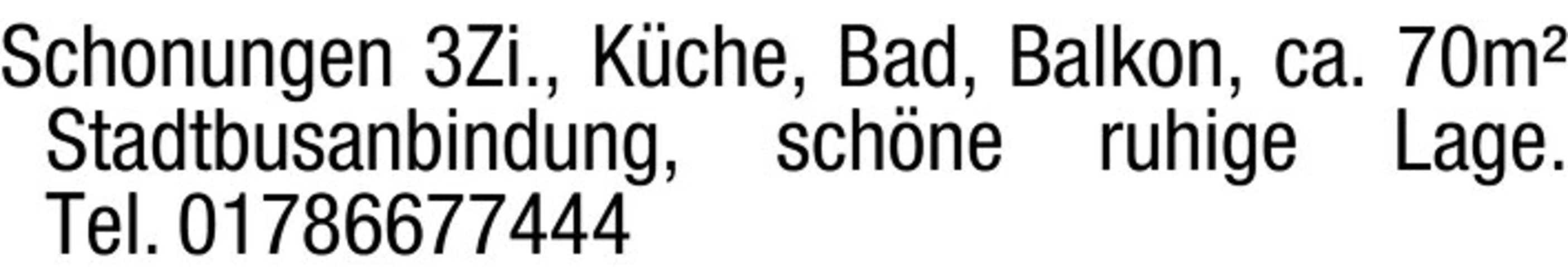 Schonungen 3Zi., Kche, Bad, Balkon, ca. 70m Stadtbusanbindung, schne ruhige Lage. Tel. 01786677444