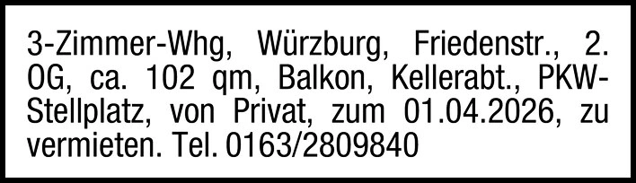 3-Zimmer-Whg, Wrzburg, Friedenstr., 2. OG, ca. 102 qm, Balkon, Kellerabt., PKW-Stellplatz, von Privat, zum 01.04.2026, zu vermieten. Tel. 0163/2809840