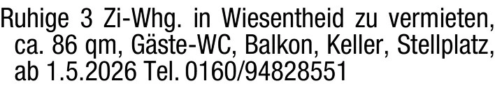 Ruhige 3 Zi-Whg. in Wiesentheid zu vermieten, ca. 86 qm, Gste-WC, Balkon, Keller, Stellplatz, ab 1.5.2026 Tel. 0160/94828551