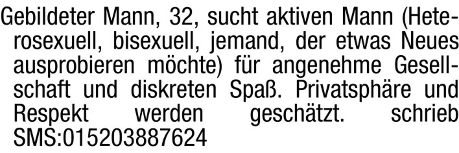 Gebildeter Mann, 32, sucht aktiven Mann (Heterosexuell, bisexuell, jemand, der etwas Neues ausprobieren möchte) für angenehme Gesellschaft und diskreten Spaß. Privatsphäre und Respekt werden geschätzt.