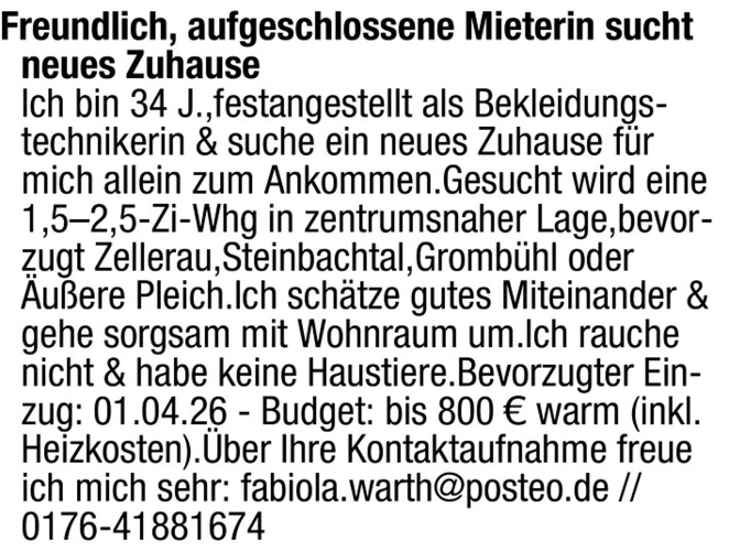 Freundlich, aufgeschlossene Mieterin sucht neues Zuhause Ich bin 34 J.,festangestellt als Bekleidungstechnikerin & suche ein neues Zuhause fr mich allein zum Ankommen.Gesucht wird eine 1,5-2,5-Zi-Whg in zentrumsnaher Lage,bevorzugt Zellerau,Steinbachtal,Grombhl oder uere Pleich.Ich schtze gutes Miteinander & gehe sorgsam mit Wohnraum um.Ich rauche nicht & habe keine Haustiere.Bevorzugter Einzug: 01.04.26 - Budget: bis 800 warm (inkl. Heizkosten).ber Ihre Kontaktaufnahme freue ich mich sehr: fabiola.warth@posteo.de // 0176-41881674