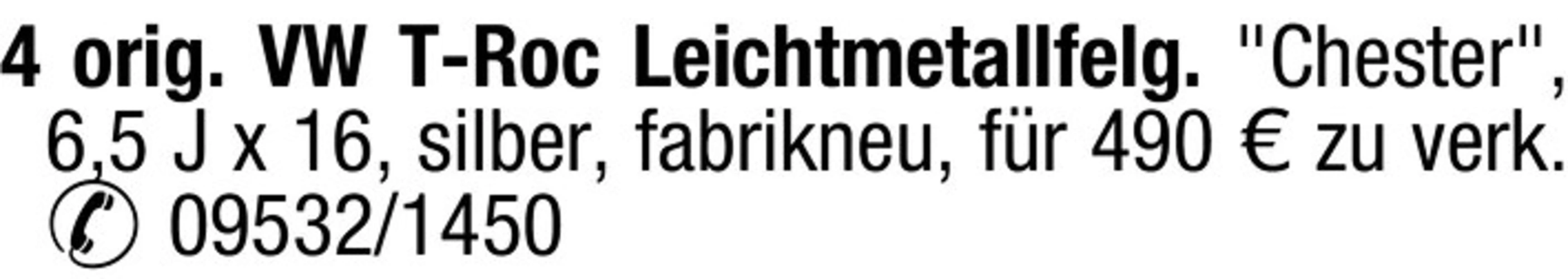 4 orig. VW T-Roc Leichtmetallfelg. "Chester", 6,5 J x 16, silber, fabrikneu, fr 490