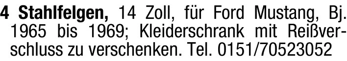 4 Stahlfelgen, 14 Zoll, für Ford Mustang, Bj. 1965 bis 1969; Kleiderschrank mit Reiverschluss zu verschenken.