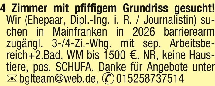 Wir (Ehepaar, Dipl.-Ing. i. R. / Journalistin) suchen in Mainfranken in 2026 barrierearm zugngl. 3-/4-Zi.-Whg. mit sep. Arbeitsbereich+2.Bad.