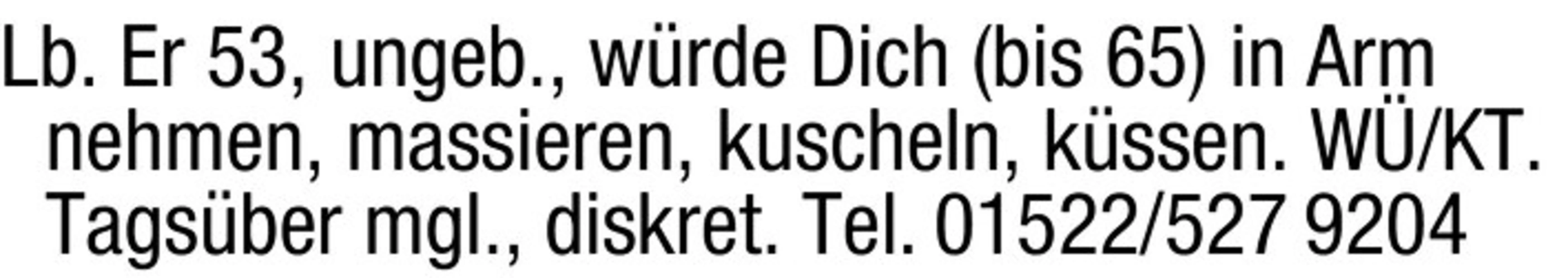 Lb. Er 53, ungeb., wrde Dich (bis 65) in Arm nehmen, massieren, kuscheln, kssen. W/KT. Tagsber mgl., diskret. Tel. 01522/527 9204