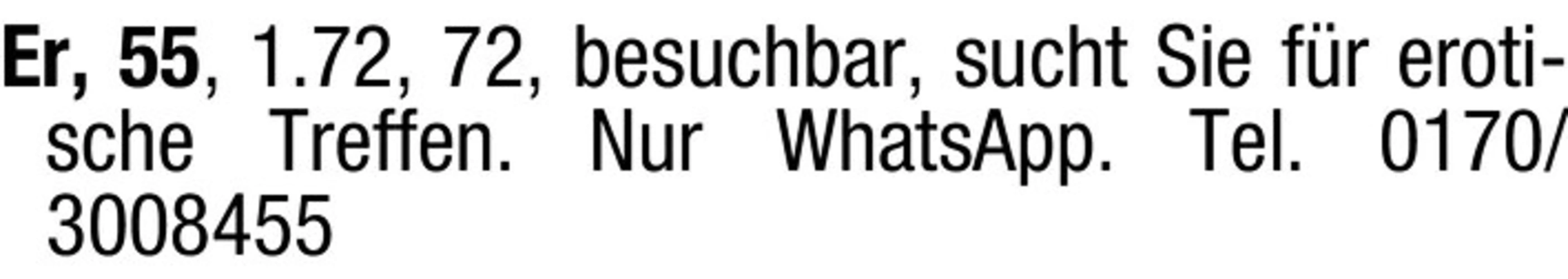 text Er, 55, 1.72, 72, besuchbar, sucht Sie fr erotische Treffen. Nur WhatsApp. Tel. 0170/3008455