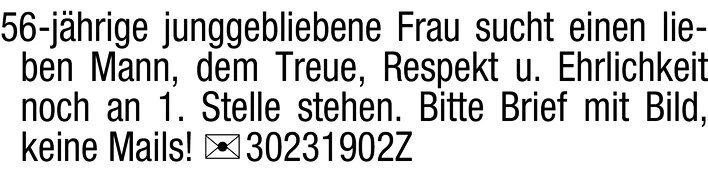 56-jhrige junggebliebene Frau sucht einen lieben Mann, dem Treue, Respekt u. Ehrlichkeit noch an 1. Stelle stehen. Bitte Brief mit Bild, keine Mails! Chiffre 30231902