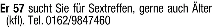 Er 57 sucht Sie fr Sextreffen, gerne auch lter (kfI). Tel. 0162/9847460