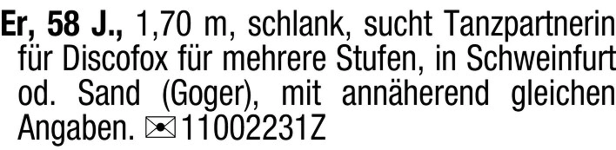 Er, 58 J., 1,70 m, schlank, sucht Tanzpartnerin fr Discofox fr mehrere Stufen, in Schweinfurt od. Sand (Goger), mit annherend gleichen Angaben. Chiffre 11002231