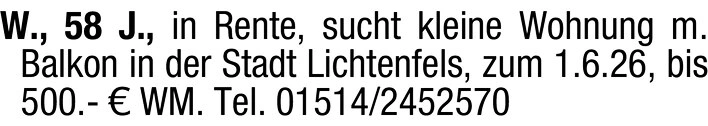 W., 58 J., in Rente, sucht kleine Wohnung m. Balkon in der Stadt Lichtenfels, zum 1.6.26, bis 500.- WM.