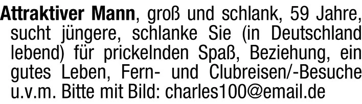 Attraktiver Mann, groß und schlank, 59 Jahre, sucht jüngere, schlanke Sie (in Deutschland lebend) für prickelnden Spaß, Beziehung, ein gutes Leben, Fern- und Clubreisen/-Besuche u.v.m.