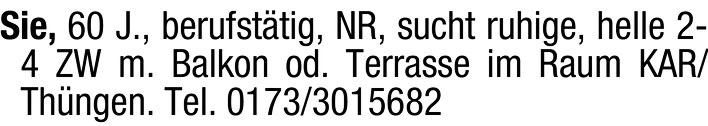 Sie, 60 J., berufstätig, NR, sucht ruhige, helle 2-4 ZW m. Balkon od. Terrasse im Raum KAR/Thngen.