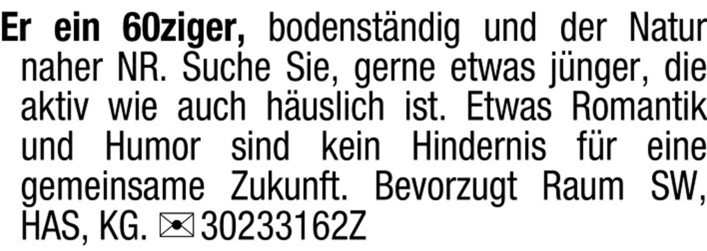 Er ein 60ziger, bodenstndig und der Natur naher NR. Suche Sie, gerne etwas jnger, die aktiv wie auch huslich ist. Etwas Romantik und Humor sind kein Hindernis fr eine gemeinsame Zukunft. Bevorzugt Raum SW, HAS, KG. Chiffre 30233162