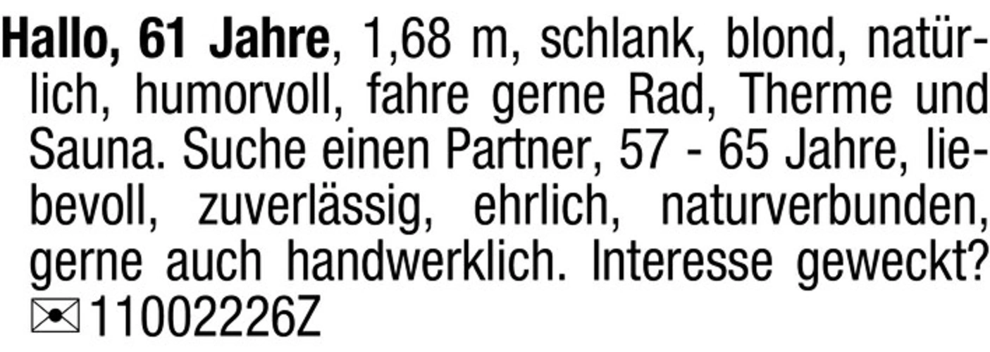Hallo, 61 Jahre, 1,68 m, schlank, blond, natrlich, humorvoll, fahre gerne Rad, Therme und Sauna. Suche einen Partner, 57 - 65 Jahre, liebevoll, zuverlssig, ehrlich, naturverbunden, gerne auch handwerklich. Interesse geweckt? Chiffre 11002226