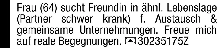 Frau (64) sucht Freundin in hnl. Lebenslage (Partner schwer krank) f. Austausch & gemeinsame Unternehmungen. Freue mich auf reale Begegnungen.