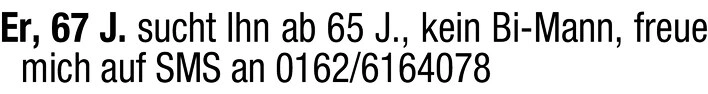 Er, 67 J. sucht Ihn ab 65 J., kein Bi-Mann, freue mich auf SMS an 0162/6164078