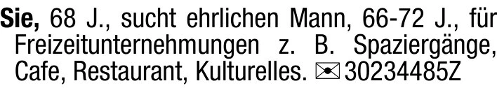 Sie, 68 J., sucht ehrlichen Mann, 66-72 J., für Freizeitunternehmungen z. B. Spaziergänge, Cafe, Restaurant, Kulturelles.