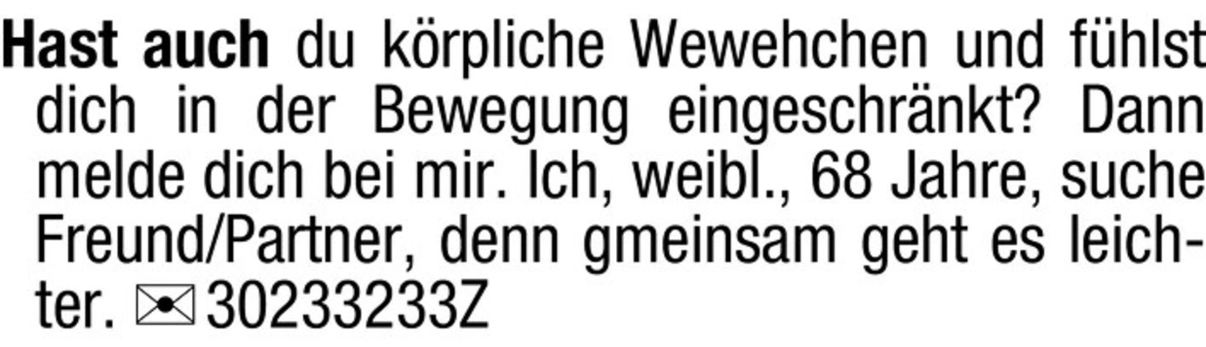 Hast auch du krpliche Wewehchen und fhlst dich in der Bewegung eingeschrnkt? Dann melde dich bei mir. Ich, weibl., 68 Jahre, suche Freund/Partner, denn gmeinsam geht es leichter. Chiffre 30233233