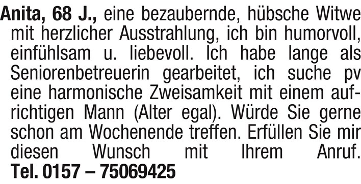 Eine bezaubernde, hübsche Witwe mit herzlicher Ausstrahlung.