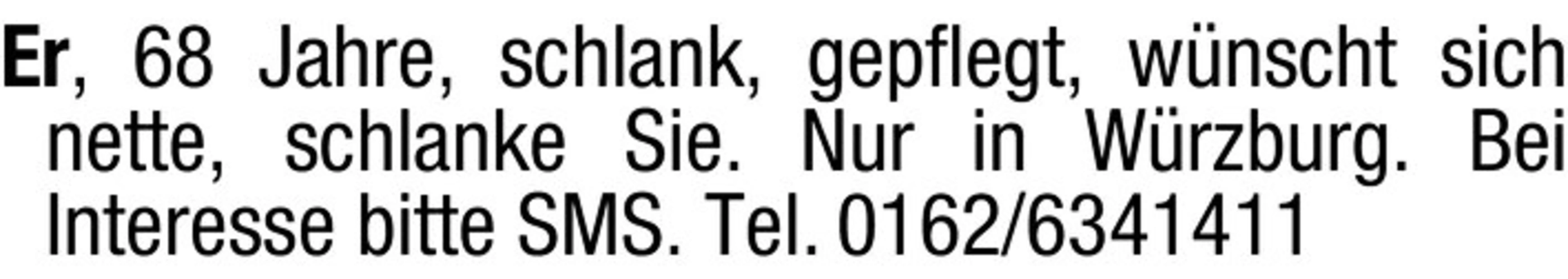 Er, 68 Jahre, schlank, gepflegt, wünscht sich nette, schlanke Sie. Nur in Würzburg. Bei Interesse bitte SMS. Tel. 0162/6341411