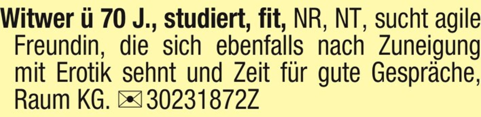 Witwer 70 J., studiert, fit, NR, NT, sucht agile Freundin, die sich ebenfalls nach Zuneigung mit Erotik sehnt und Zeit fr gute Gesprche, Raum KG. Chiffre 30231872