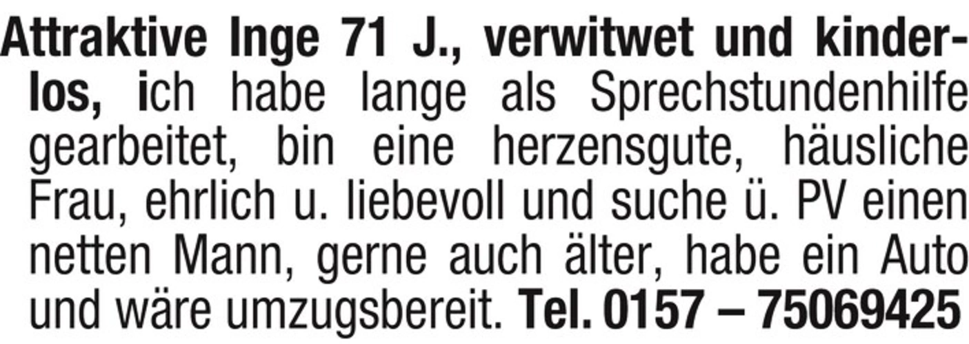 Attraktive Inge 71 J., verwitwet und kinderlos, ich habe lange als Sprechstundenhilfe gearbeitet, bin eine herzensgute, husliche Frau, ehrlich u. liebevoll und suche . PV einen netten Mann, gerne auch lter, habe ein Auto und wre umzugsbereit.