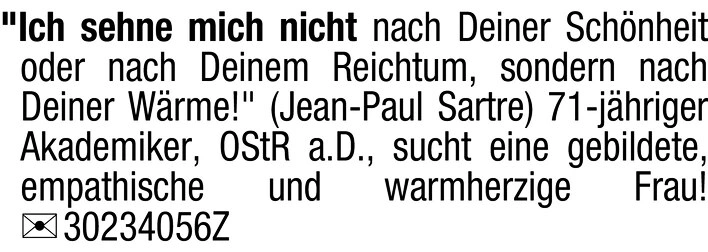 "Ich sehne mich nicht nach Deiner Schönheit oder nach Deinem Reichtum, sondern nach Deiner Wärme!" (Jean-Paul Sartre)