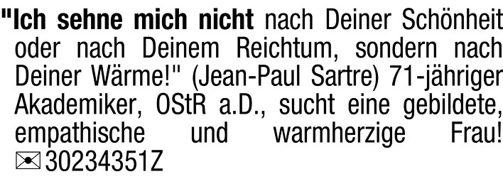 "Ich sehne mich nicht nach Deiner Schönheit oder nach Deinem Reichtum, sondern nach Deiner Wärme!" (Jean-Paul Sartre)