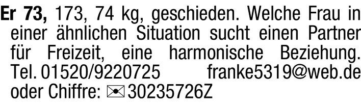 Er 73, 173, 74 kg, geschieden. Welche Frau in einer ähnlichen Situation sucht einen Partner für Freizeit, eine harmonische Beziehung.