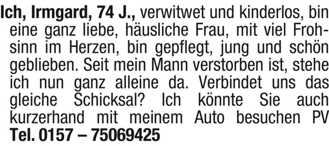 text Ich, Irmgard, 74 J., verwitwet und kinderlos, bin eine ganz liebe, husliche Frau, mit viel Frohsinn im Herzen, bin gepflegt, jung und schn geblieben. Seit mein Mann verstorben ist, stehe ich nun ganz alleine da. Verbindet uns das gleiche Schicksal? Ich knnte Sie auch kurzerhand mit meinem Auto besuchen PV Tel. 0157 - 75069425