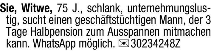 Sie, Witwe, 75 J., schlank, unternehmungslustig, sucht einen geschäftstchtigen Mann, der 3 Tage Halbpension zum Ausspannen mitmachen kann. WhatsApp möglich. Chiffre 18002192