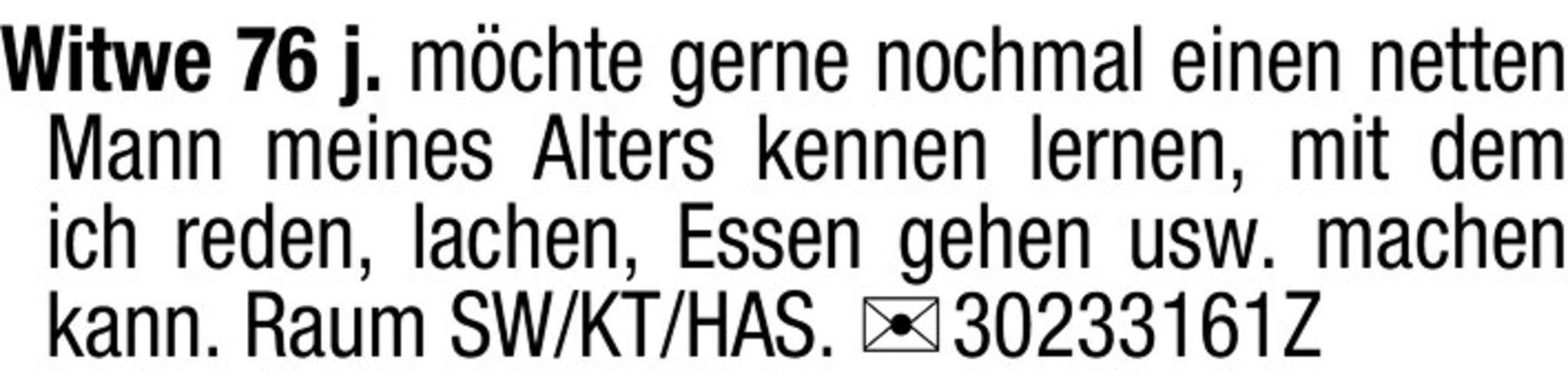 Witwe 76 j. mchte gerne nochmal einen netten Mann meines Alters kennen lernen, mit dem ich reden, lachen, Essen gehen usw. machen kann. Raum SW/KT/HAS. Chiffre 30233161