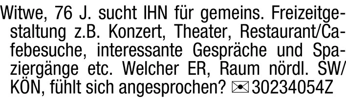 Witwe, 76 J. sucht IHN für gemeinsame Freizeitgestaltung z.B. Konzert, Theater, Restaurant/Cafebesuche, interessante Gespräche und Spaziergänge etc.