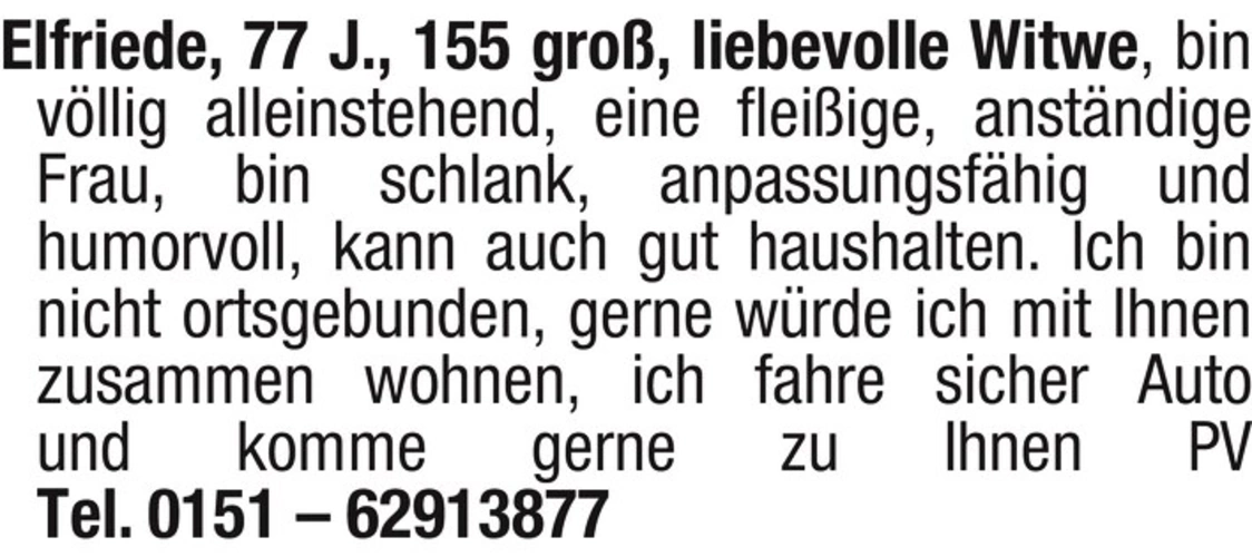 Elfriede, 77 J., 155 gro, liebevolle Witwe, bin vllig alleinstehend, eine fleiige, anstndige Frau, bin schlank, anpassungsfhig und humorvoll, kann auch gut haushalten. Ich bin nicht ortsgebunden, gerne wrde ich mit Ihnen zusammen wohnen, ich fahre sicher Auto und komme gerne zu Ihnen PV Tel. 0151 - 62913877