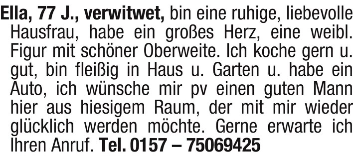 Ella, 77 J., verwitwet, bin eine ruhige, liebevolle Hausfrau, habe ein großes Herz, eine weibl. Figur mit schöner Oberweite. Ich koche gern u. gut, bin fleißig in Haus u. Garten u. habe ein Auto, ich wünsche mir pv einen guten Mann hier aus hiesigem Raum, der mit mir wieder glücklich werden möchte. Gerne erwarte ich Ihren Anruf.