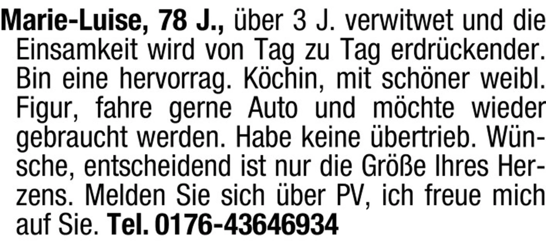 78-jährige Witwe sucht Gesellschaft und Zuneigung