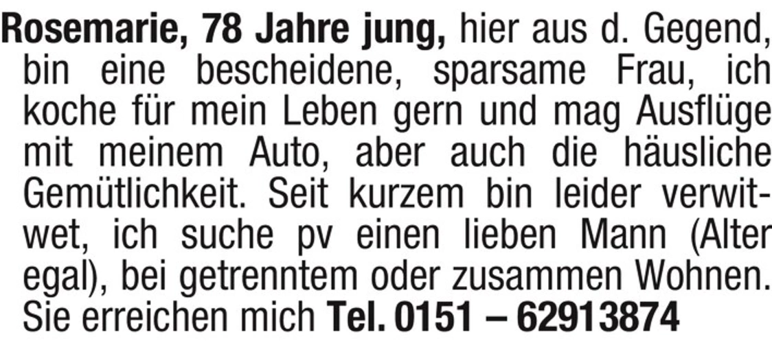 Rosemarie, 78 Jahre jung, hier aus d. Gegend, bin eine bescheidene, sparsame Frau, ich koche fr mein Leben gern und mag Ausflge mit meinem Auto, aber auch die husliche Gemtlichkeit. Seit kurzem bin leider verwitwet, ich suche pv einen lieben Mann (Alter egal), bei getrenntem oder zusammen Wohnen. Sie erreichen mich Tel. 0151 - 62913874