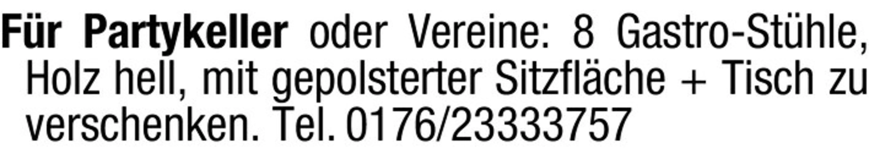 text Fr Partykeller oder Vereine: 8 Gastro-Sthle, Holz hell, mit gepolsterter Sitzflche Tisch zu verschenken. Tel. 0176/23333757